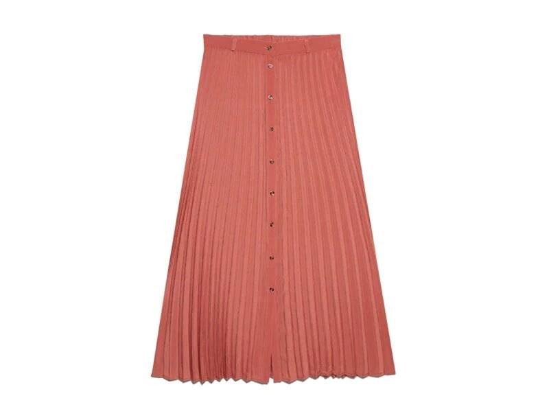 A pliszírozott vagy más néven rakott szoknya idén is hódít, főleg midi hosszúságban. Legnagyobb előnye, hogy kiegészítőtől függően változatosan hordható darab: tornacipővel vagány, magassarkú szandállal elegáns megjelenést ad. Mi egy könnyed anyagból készült, élénk korall színű darabot mutatunk a Stradivarius választékából.